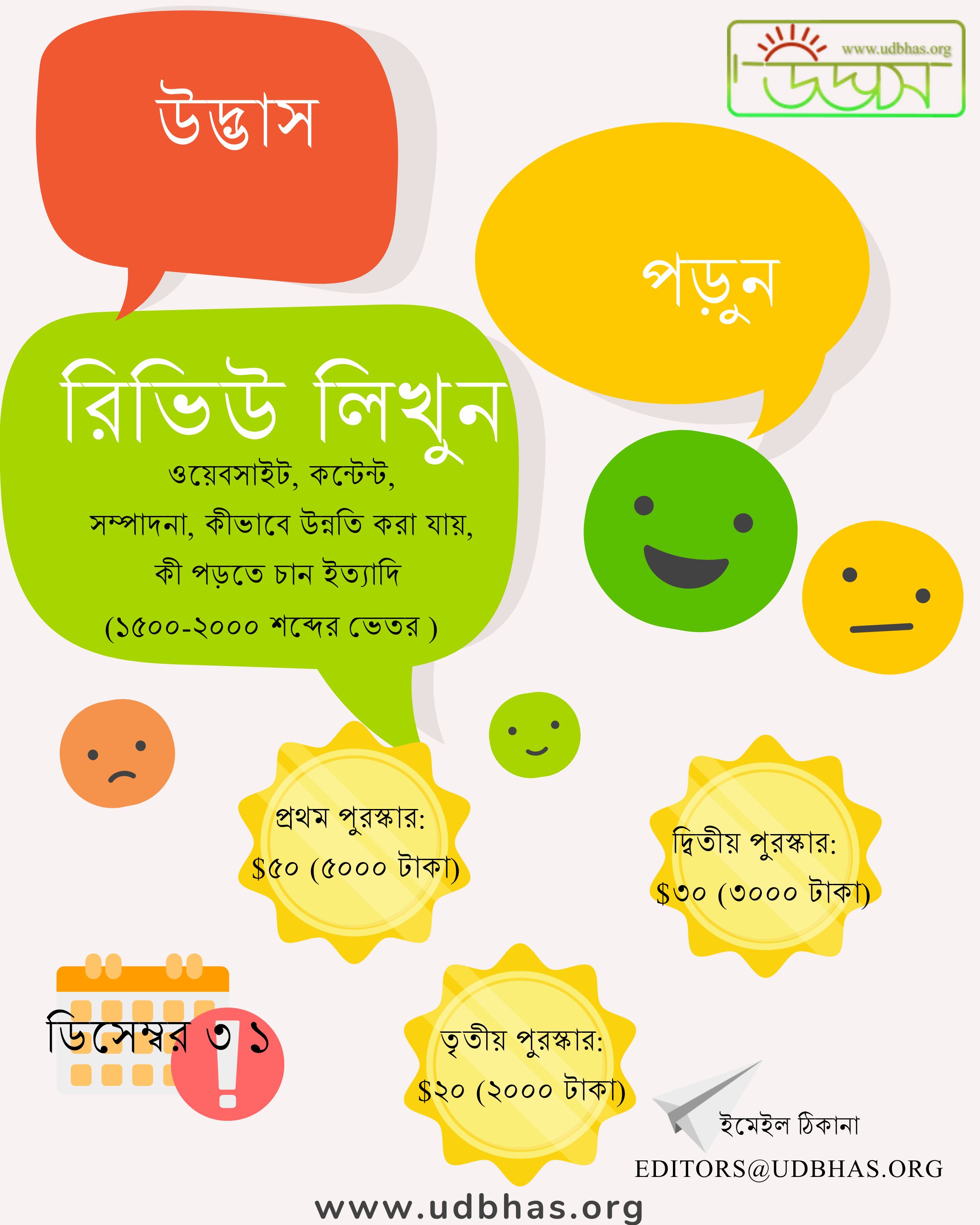 'পাঠ-প্রতিযোগিতা উদ্ভাসের সকল পাঠককে সাদর আমন্ত্রণ জানাই। অংশগ্রহণ করুন, উদ্ভাস পড়ুন এবং ১৫০০ থেকে ২০০০ শব্দের ভেতর রিভিউ লিখুন - ওয়েবসাইট, কন্টেন্ট, সম্পাদনা - কী ভালো লাগে, কোথায় উন্নতি প্রয়োজন, কী পড়তে চান, কী পড়তে চান না বিস্তারিত ভাবে লিখুন। সব নির্বাচিত প্রতিক্রিয়া উদ্ভাসের ওয়েবসাইটে প্রকাশিত হবে। প্রথম পুরস্কার $৫০ (৫০০০ টাকা), দ্বিতীয় পুরস্কার $৩০ (৩০০০ টাকা) এবং তৃতীয় পুরস্কার $২০ (২০০০ টাকা)। জমা দেবার শেষ তারিখ নভেম্বর ৩০, ২০২৫। পাঠানোর ঠিকানা editors@udbhas.org